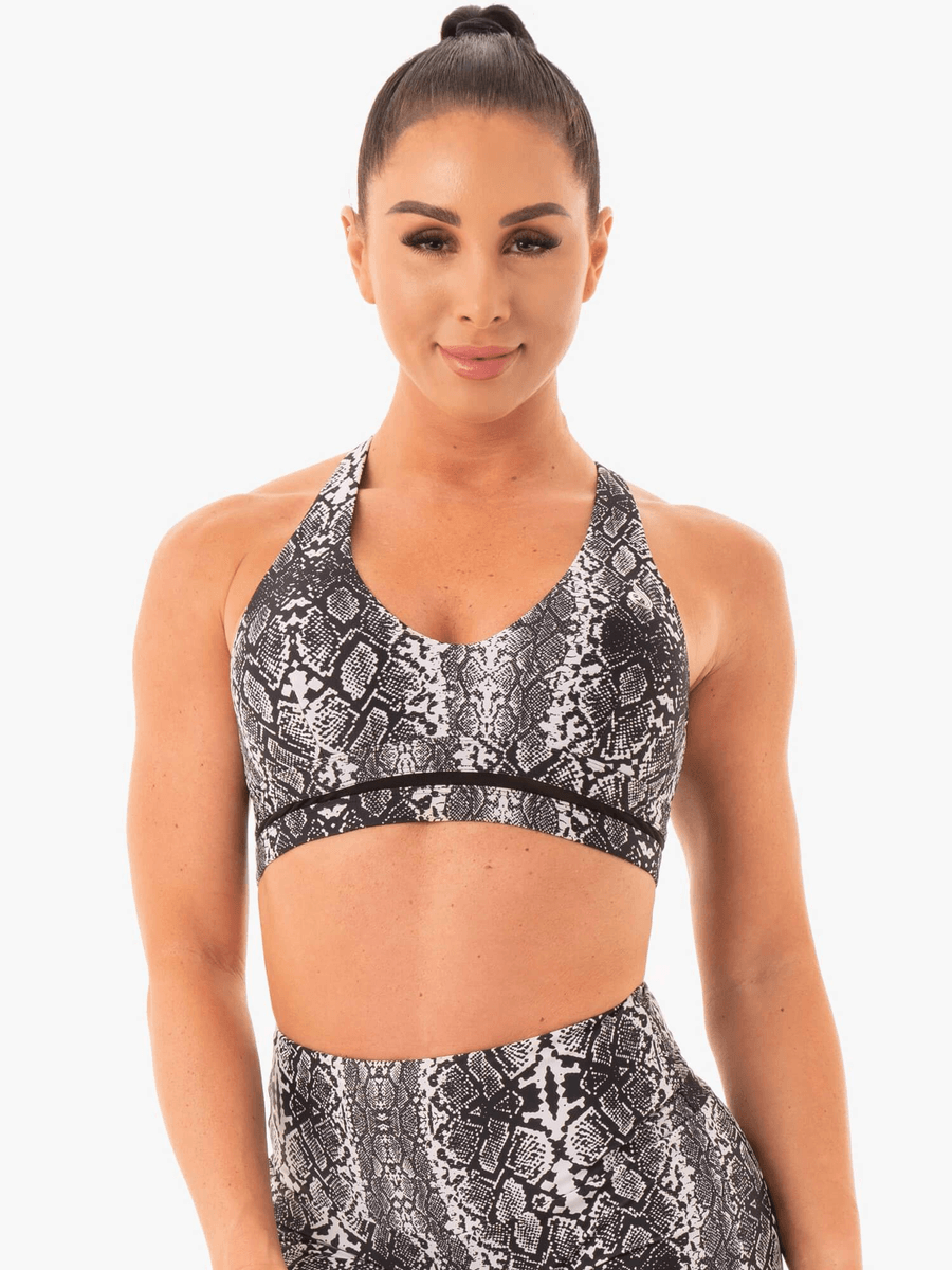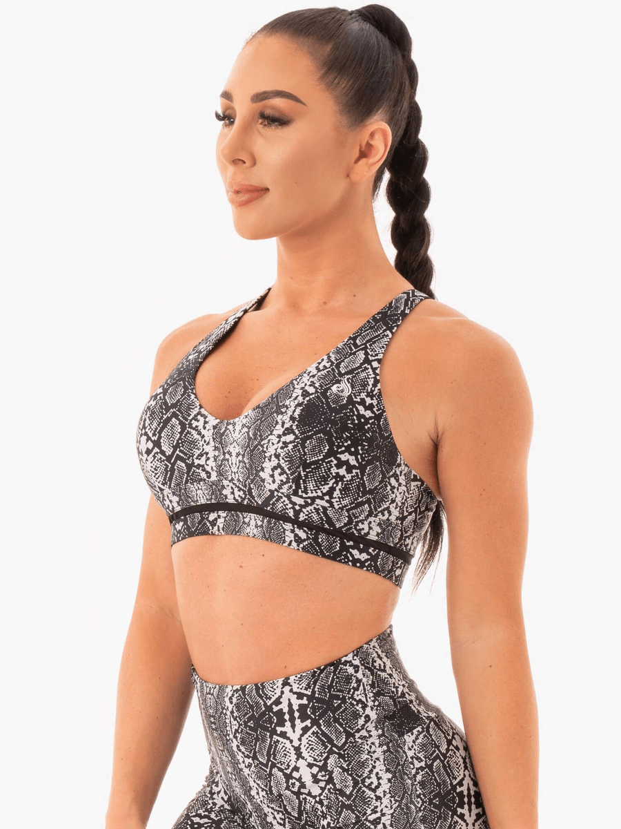 Unleash your potential with the Ryderwear NEM X RW Sports Bra - White Snake. Designed for the modern woman who knows her worth, this sports bra combines style and functionality to support you through every workout.