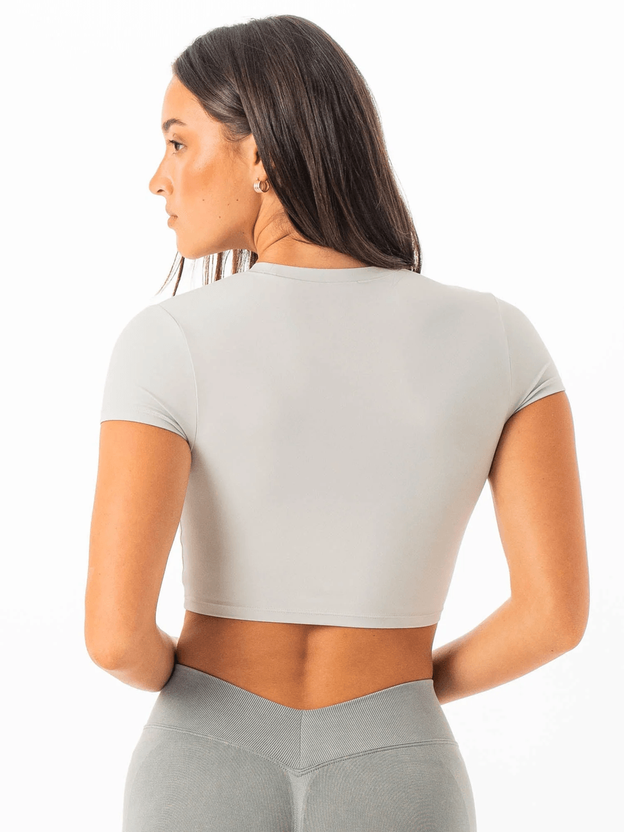 The Ryderwear NKD Cropped Tee - Sage is crafted from our premium NKD fabric, which is buttery soft and lightweight. This cropped tee is perfect for training, Pilates, or everyday wear, ensuring you look and feel great no matter the occasion. The slim fit design accentuates your body while the breathable material ensures comfort during your toughest workouts.