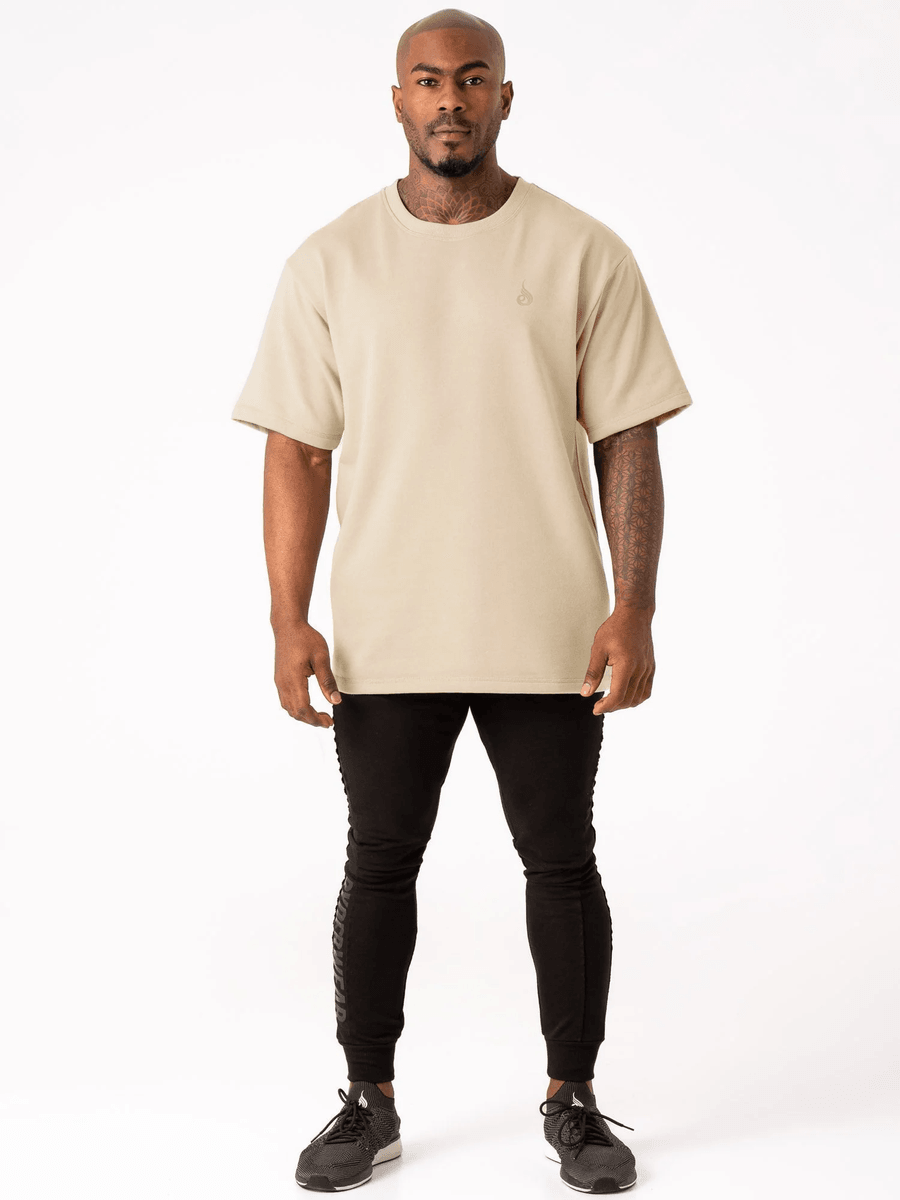 Elevate your workout wardrobe with the Ryderwear Throwback Fleece Oversized T-Shirt - Stone. Designed for ultimate comfort and style, this oversized lifting tee is perfect for both training and casual wear.