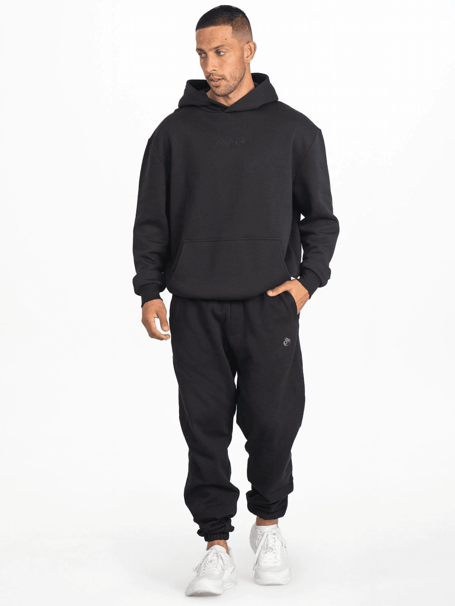 The Ryderwear Unisex Hoodie - Black features a chic oversized silhouette that caters to all body types, ensuring you stay stylish without sacrificing comfort. The ribbed sleeve and body cuff detailing adds a touch of sophistication, making it ideal for both workouts and casual outings. With a male model standing at 181cm, typically wearing a size M, this hoodie fits perfectly on him, showcasing its versatile appeal.