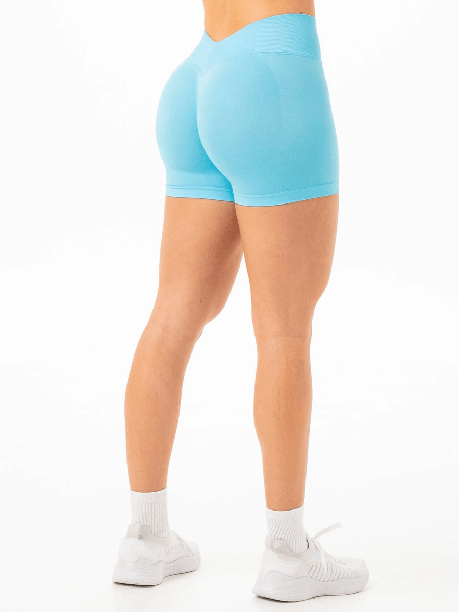 The Ryderwear Boost V Back Shorts - Baby Blue are perfect for any workout, from intense glute training sessions to relaxed rest days. Crafted with our signature invisible scrunch and contour shading, these shorts lift, define, and enhance without harsh lines or seams. The high-waisted design not only offers support but also creates a snatched silhouette that boosts your confidence.