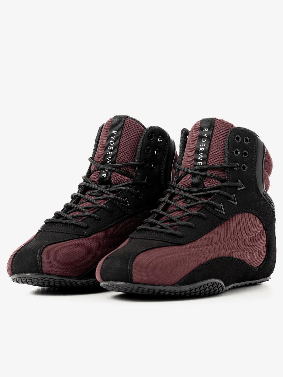 The Ryderwear D-Mak Rogue 2 - Burgundy features a thin, flat rubber sole that offers a barefoot feel, maximizing your grip and stability during heavy lifts. Its classic high top design grants unrivaled ankle support, making it an essential addition to your lifting gear. Lightweight yet robust, these shoes are crafted for bodybuilders who demand performance and confidence in every lift.