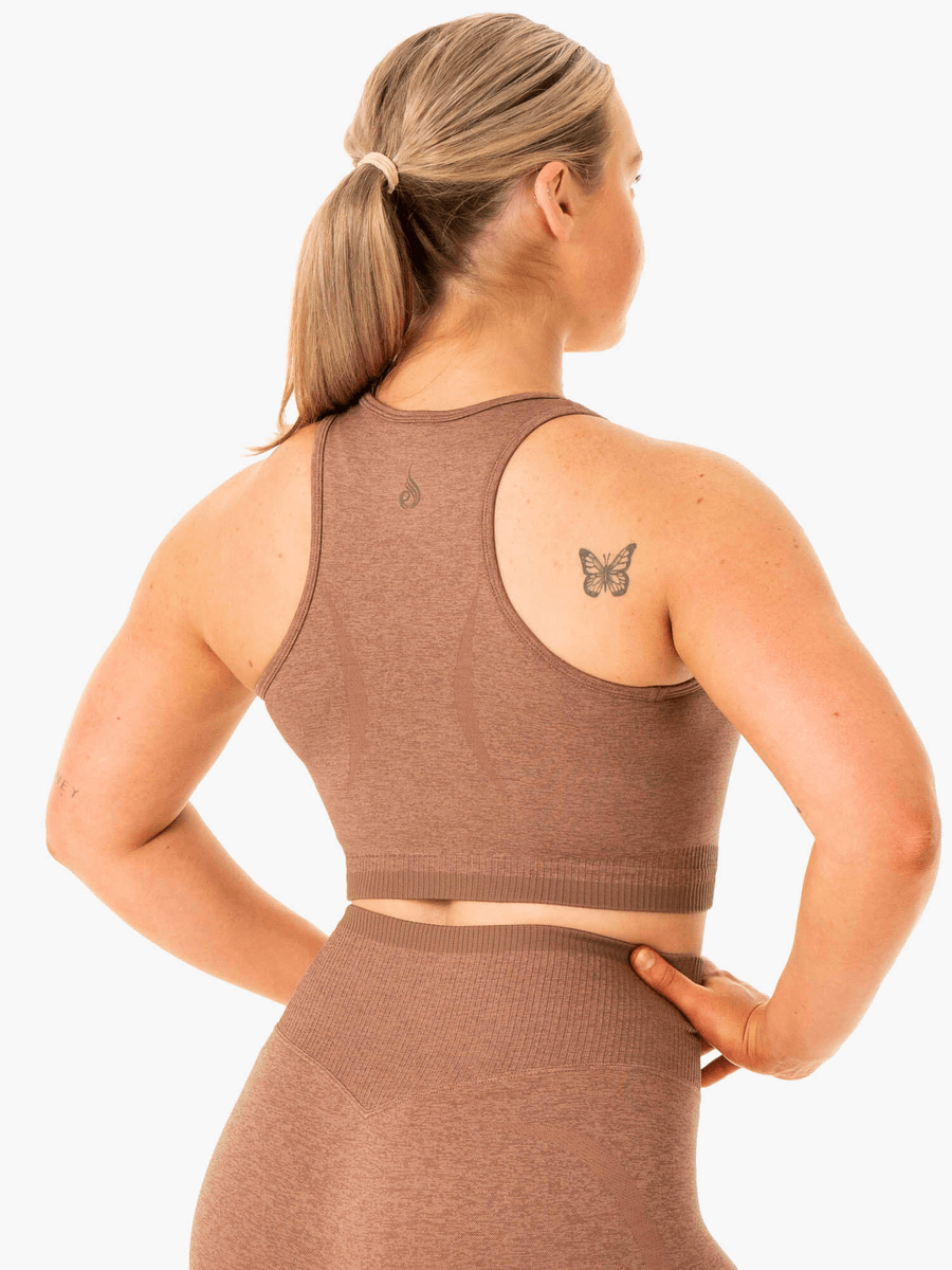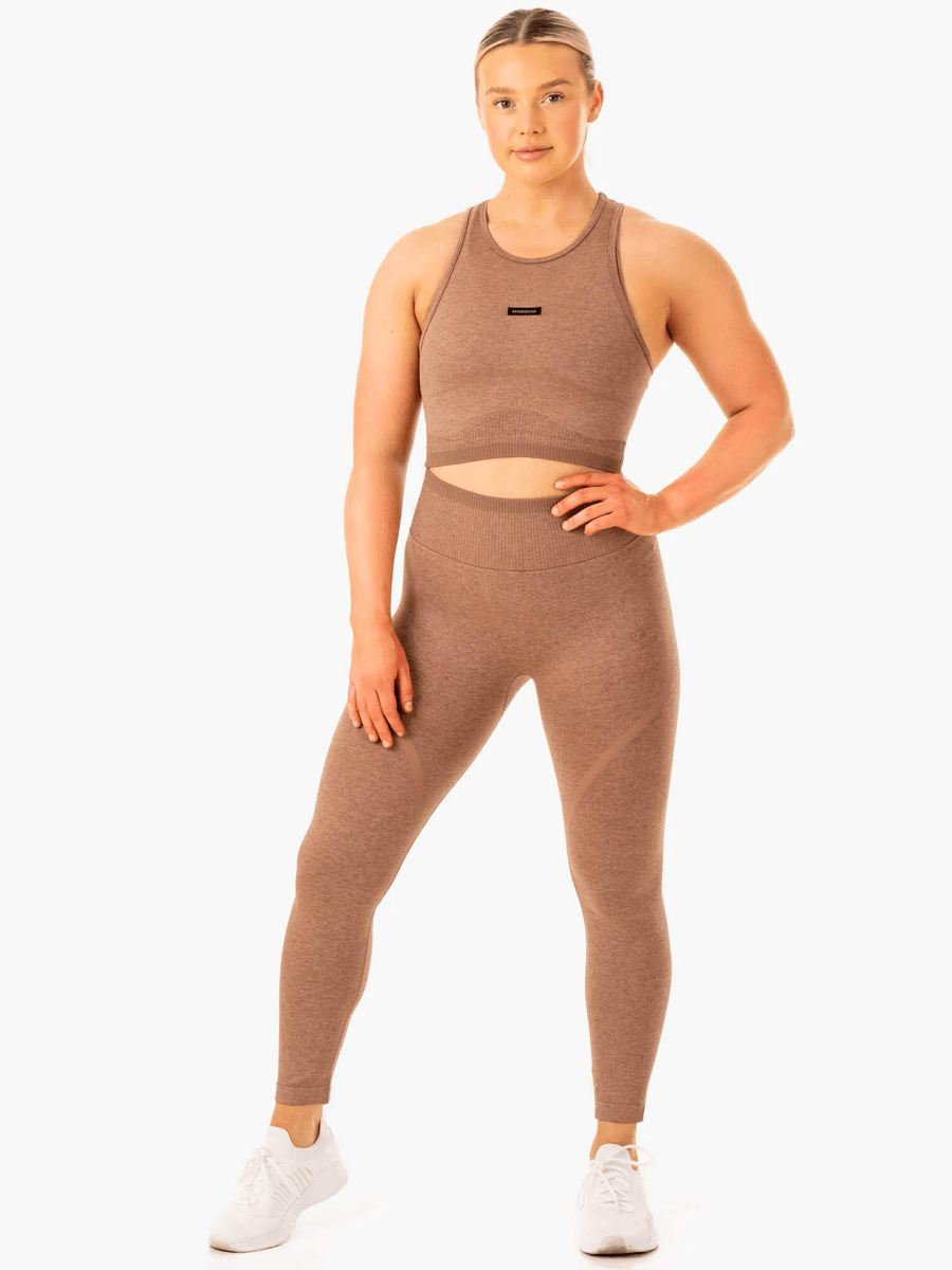 Elevate your workout wardrobe with the Ryderwear Excel Seamless Tank - Mocha Marl. Designed for the modern athlete, this cropped tank combines style and functionality, ensuring you look great while maximizing your performance.