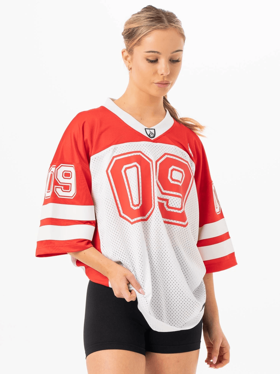 Step up your workout wardrobe with the Ryderwear Varsity Jersey - Red. This oversized style t-shirt combines comfort with sporty aesthetics, making it the perfect choice for both training sessions and casual outings.
