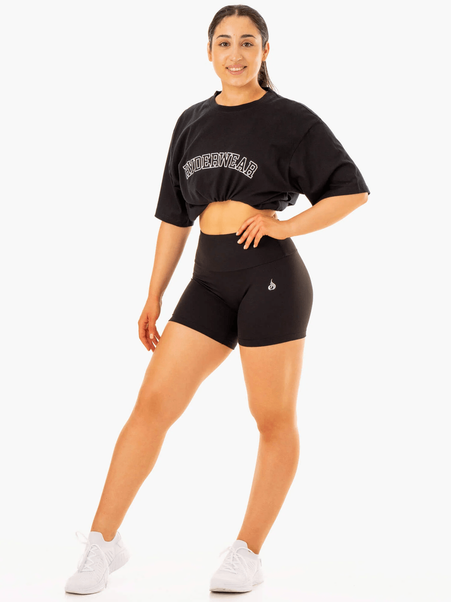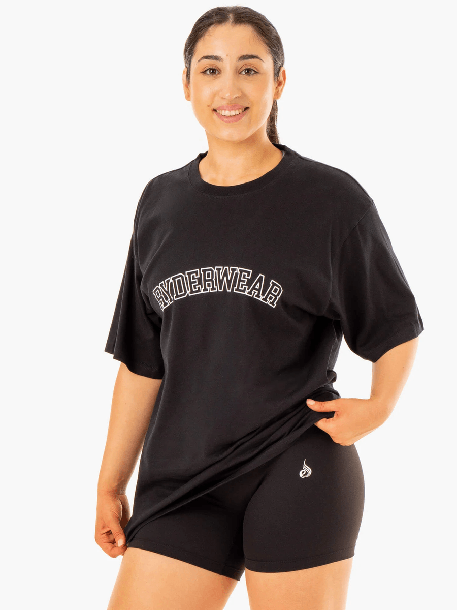 The Ryderwear Oversized T-Shirt - Black is crafted from 100% cotton, ensuring a soft touch against your skin while providing exceptional airflow during intense workouts. Its collegiate style print on the front chest adds a trendy flair, allowing you to showcase your passion for fitness and fashion.