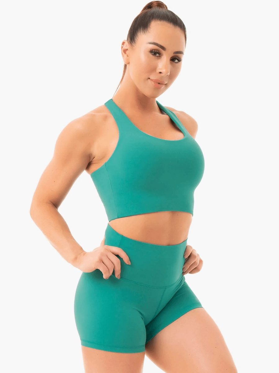 The Ryderwear NKD Sports Bra - Turquoise features a long-line racerback design that not only flatters your silhouette but also provides robust support for every move you make. Its luxurious fabric is designed to be paired perfectly with our NKD leggings, creating the softest, most unrestrictive active set in your wardrobe. Whether you're hitting the gym, flowing through yoga poses, or tackling a pilates session, this sports bra has got you covered.