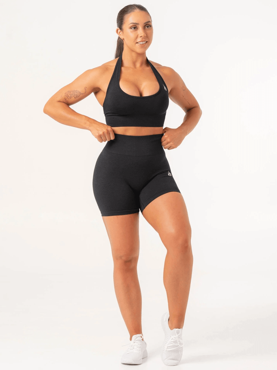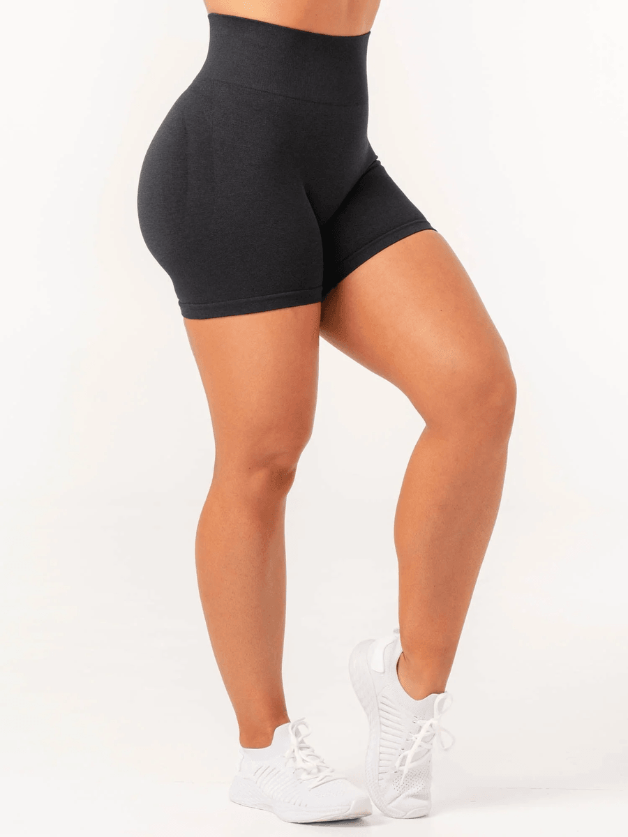 The Ryderwear Contour Seamless Shorts - Black Marl are your ultimate fitness companion. With a sleek and stylish design, these shorts empower you to conquer your workouts with confidence. The high-waisted fit accentuates your silhouette while providing necessary support. The foldover waistband keeps you secure, allowing you to focus on your performance without distractions.